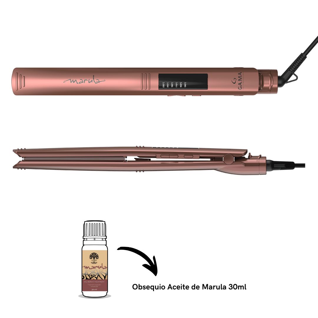 Plancha de Pelo Gama Marula Led Display 4D THERAPY ULTRA OZONE ION + Aceite de Marula 30ml, Creada para usar con Aceite de Marula para proteger, nutrir, sellar puntas y eliminar el frizz de tu cabello. nutre sin sobre cargar el cabello, da brillo y suavidad.