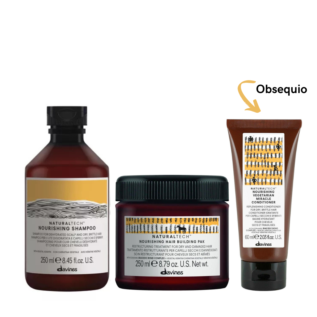 Set Reparación Completa para Cabello Seco y Dañado Davines NOURISHING creado para nutrir, revitalizar el cabello deshidratado, dañado, seco, des-estructurado y quebradizo, reparando y reestructurando la fibra capilar, devolviendo la hidratación natural y flexibilidad al pelo, puntas sanas y brillo extremo.