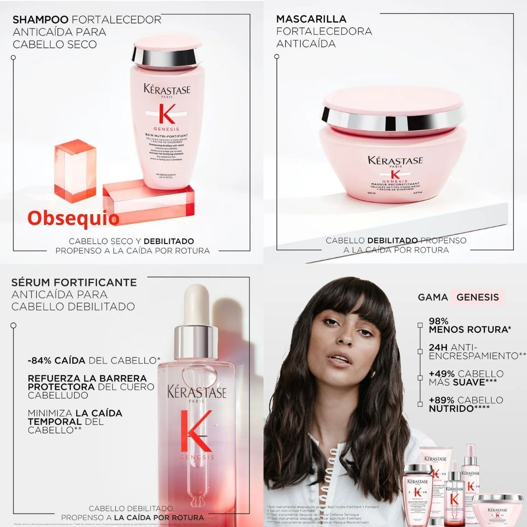 Rutina Completa Anti Caída, Anti Quiebre y Fortalecimiento Capilar Génesis Kérastase, Shampoo, Mascarilla y Sérum (Suero) combinación creada para controlar la caída del cabello (generando anclaje del cabello desde la raíz), fortaleciendo el cabello debilitado, nutriéndolo e hidratándolo, aportando mas resistencia, logrando reducir la rotura, fortaleciéndola y dando suaviza y brillo. Cabello mas resistente desde la raíz y cuero cabelludo equilibrado. Especializado para pelo fino o delgado y cuero cabelludo seco.