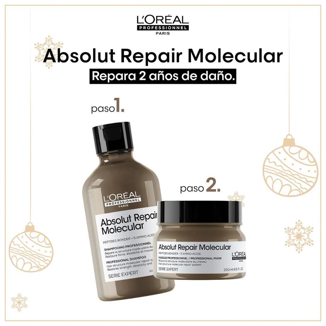 Kit Navidad para Reparar y Fortalecer Cabello muy Dañado ABSOLUT REPAIR MOLECULAR L’Oreal Serie Expert Professionnel, Shampoo y Mascarilla diseñados para reparar y proteger la estructura del cabello, trabajando desde adentro hacia afuera, como resultado cabello mas fuerte, renovado, mas nutrido, suave y brillante.