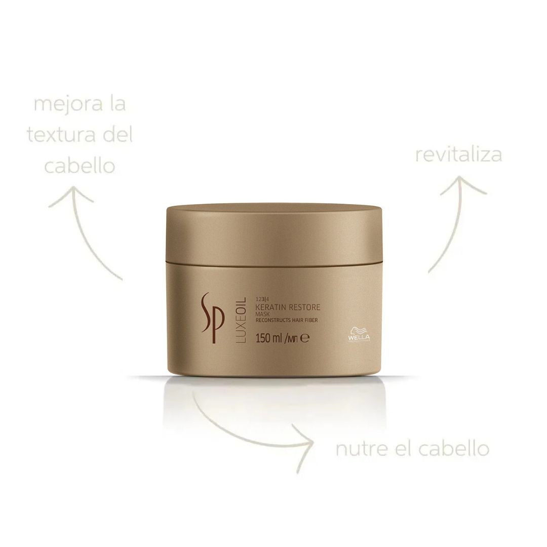 Mascarilla Reconstructora SP LUXEOIL Wella Keratin Restore, creada como una mascarilla que repara la fibra capilar y gracias a la queratina mejora ampliamente textura del cabello dañado, devolviendo la suavidad y manejabilidad, enriquecida con aceites preciosos y polímeros especiales que aportan nutrición e hidratación al cabello, su poder limpiador brinda protección al cabello, dejándolo nuevamente joven y fuerte.